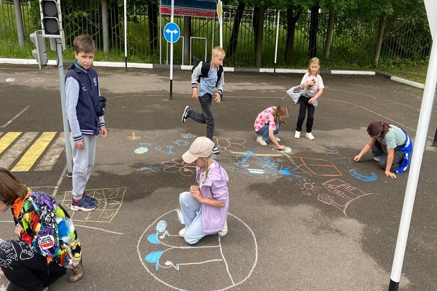 Сотрудница Рузской городской библиотеки провела конкурс рисунков на асфальте «Мы рисуем мир!» для ребят из школьного лагеря «Дружба».